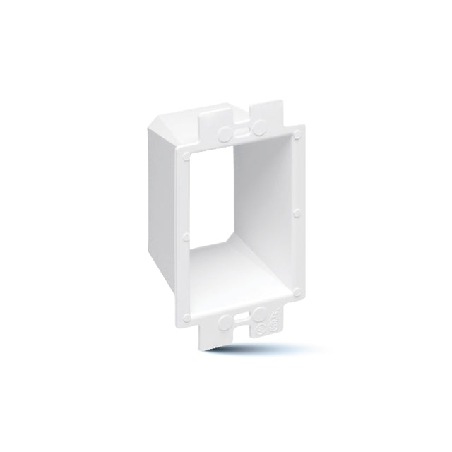 One-gang plastic extension ring for set-back metal boxes, designed to extend the box depth and bring the device mounting surface flush with the wall, made from durable, non-conductive plastic for safe and reliable performance, ideal for correcting recessed electrical boxes during renovations or drywall installation in residential and commercial settings.
