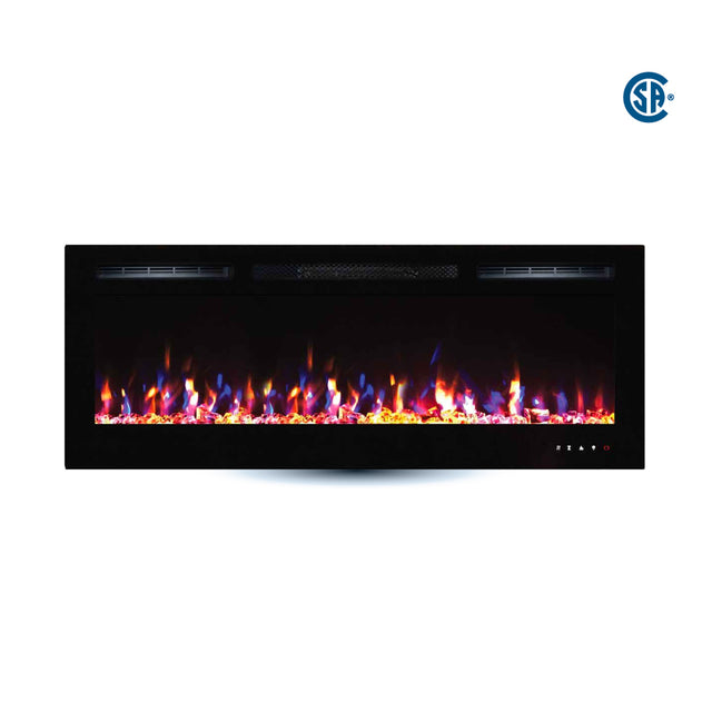 The 60" wall-mounted, recessed electric fireplace offers a sleek, space-saving design and features five levels of flame brightness adjustment, allowing you to create the perfect ambiance for any setting.