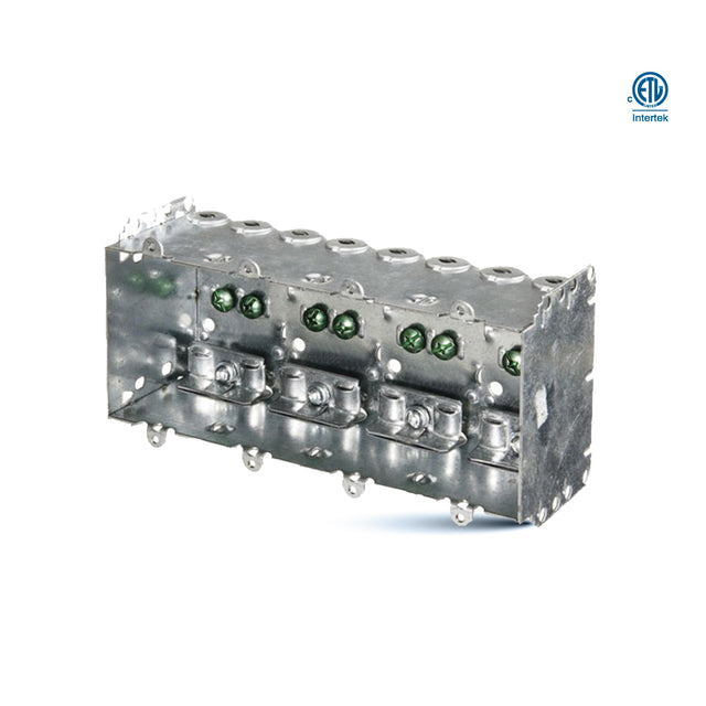 Four gang device box with clamps, designed to accommodate up to four electrical devices in a single enclosure, featuring integrated cable clamps for secure and organized wire retention, ideal for high-capacity installations in residential, commercial, or industrial settings where space and safety are critical.