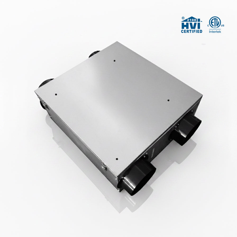The Energy Recovery Ventilator features an efficient cross-flow core and integrated pressure ports, enabling optimal air balancing and enhanced energy savings for residential or commercial ventilation systems.
