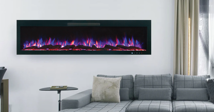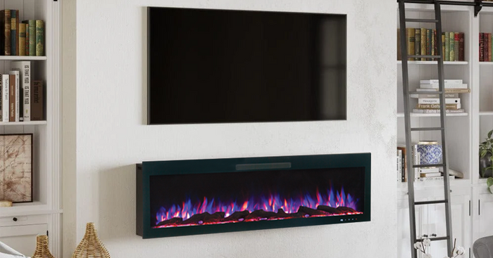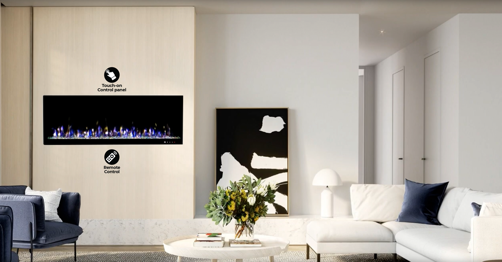 The 50" sleek, space-saving electric fireplace is designed for either wall-mounted or recessed installation, offering a seamless blend of modern style and cozy warmth to enhance any room.