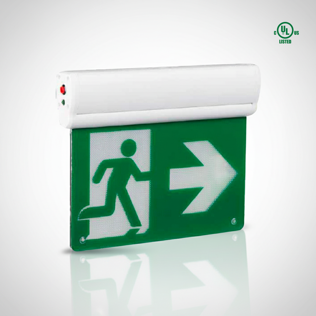 LED Edge-Lit Running Man Exit Sign - Energy-efficient 2W model operating at 120–347V AC, designed for universal mounting on walls, ceilings, or sides.