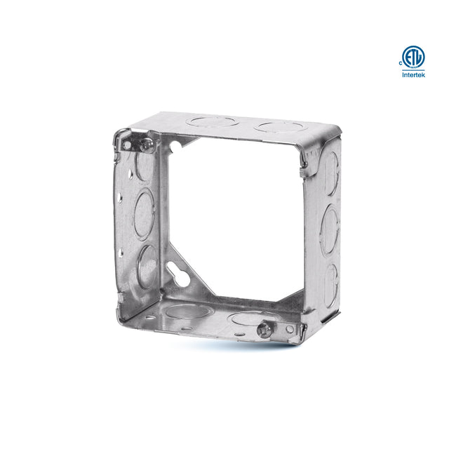 4" square extension box, 2-1/8" deep, constructed from heavy-duty galvanized steel, designed to increase the capacity of standard 4" square electrical boxes, offering extra depth to accommodate complex wiring arrangements, larger devices, or code-mandated wire fill requirements, making it suitable for demanding electrical installations in residential, commercial, or industrial environments.