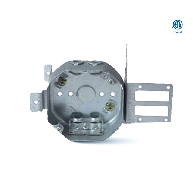 Steel octagonal metal electrical box with side bracket and built-in clamps, fabricated from heavy-duty galvanized steel for superior durability and corrosion resistance, designed to house electrical connections or support lighting fixtures, featuring an integrated side bracket for secure mounting to structural framing and factory-installed clamps that provide reliable cable retention, ensuring safe and efficient installations in residential, commercial, or industrial settings.
