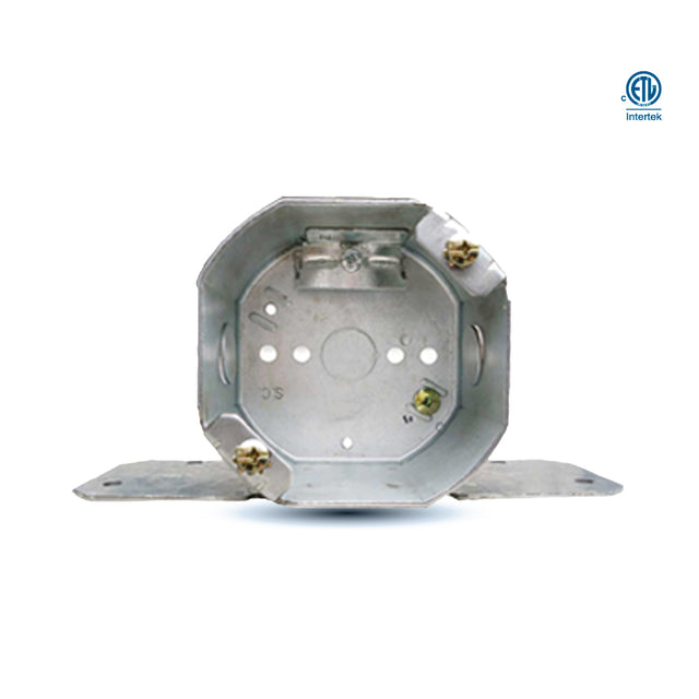 4" octagon ceiling fan support box, constructed from high-strength galvanized steel for enhanced durability and load-bearing capacity, specifically designed to securely support ceiling fans or heavy lighting fixtures, featuring reinforced mounting points and a robust structure that ensures safe and stable installation to ceiling joists, making it ideal for residential or commercial applications requiring reliable overhead fixture support.