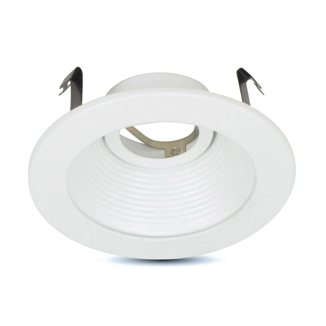 Round 4″ MR16 50W max. voltage trim, compatible with MR16 bulbs up to 50 watts, features a sleek round design and is available in various color options to complement different interior styles, offering both functional lighting and aesthetic versatility for residential or commercial recessed applications.