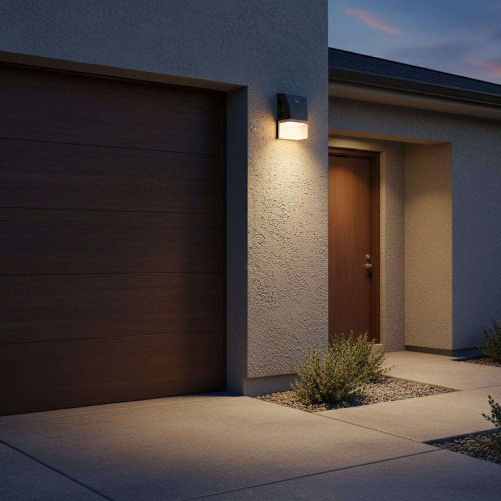 LED mini wall pack with integrated photocell sensor, featuring selectable CCT and wattage.