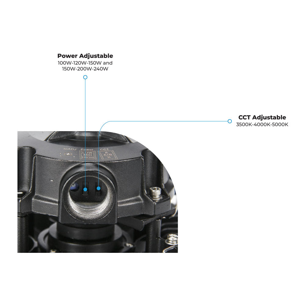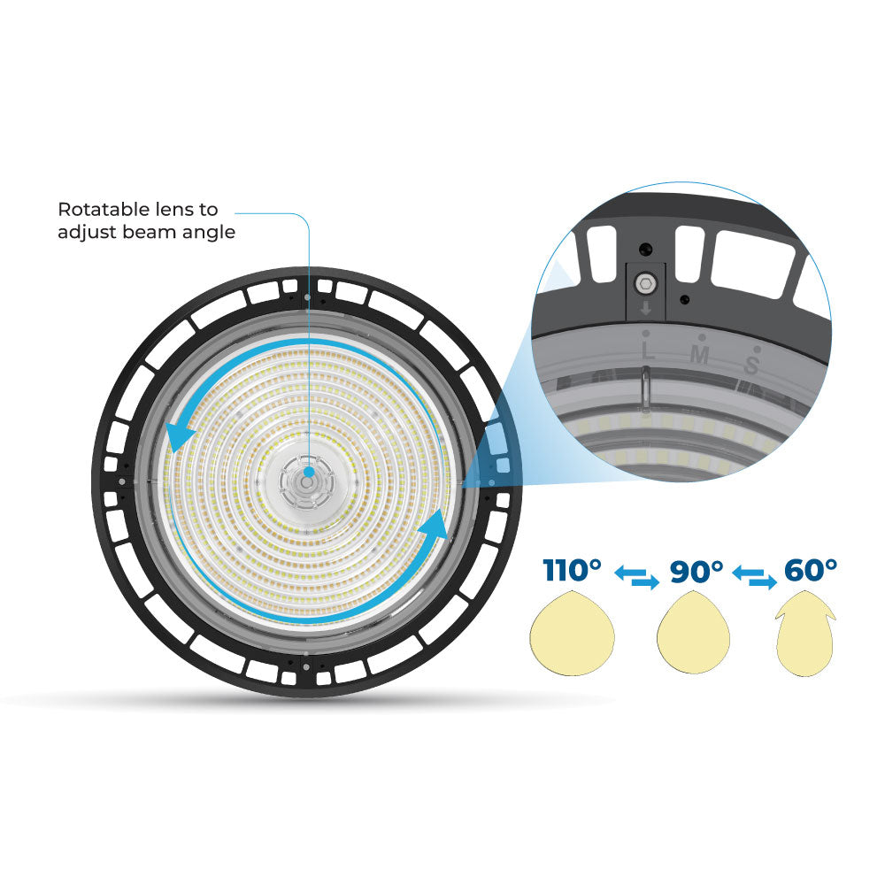 Des éclairages UFO à haute intensité simples, élégants, compacts et légers, avec température de couleur et puissance sélectionnables.
